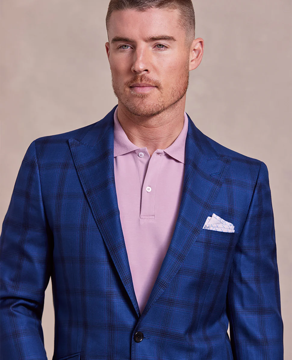 Woven in England by World-Renowned Scabal, this soft jacket has an intelligent 2-button stance that will easily elevate your casual look. Hand-Crafted with a peak lapel, welt chest pocket, and patch pockets, finished with shell buttons, interior pockets, and double vented back.